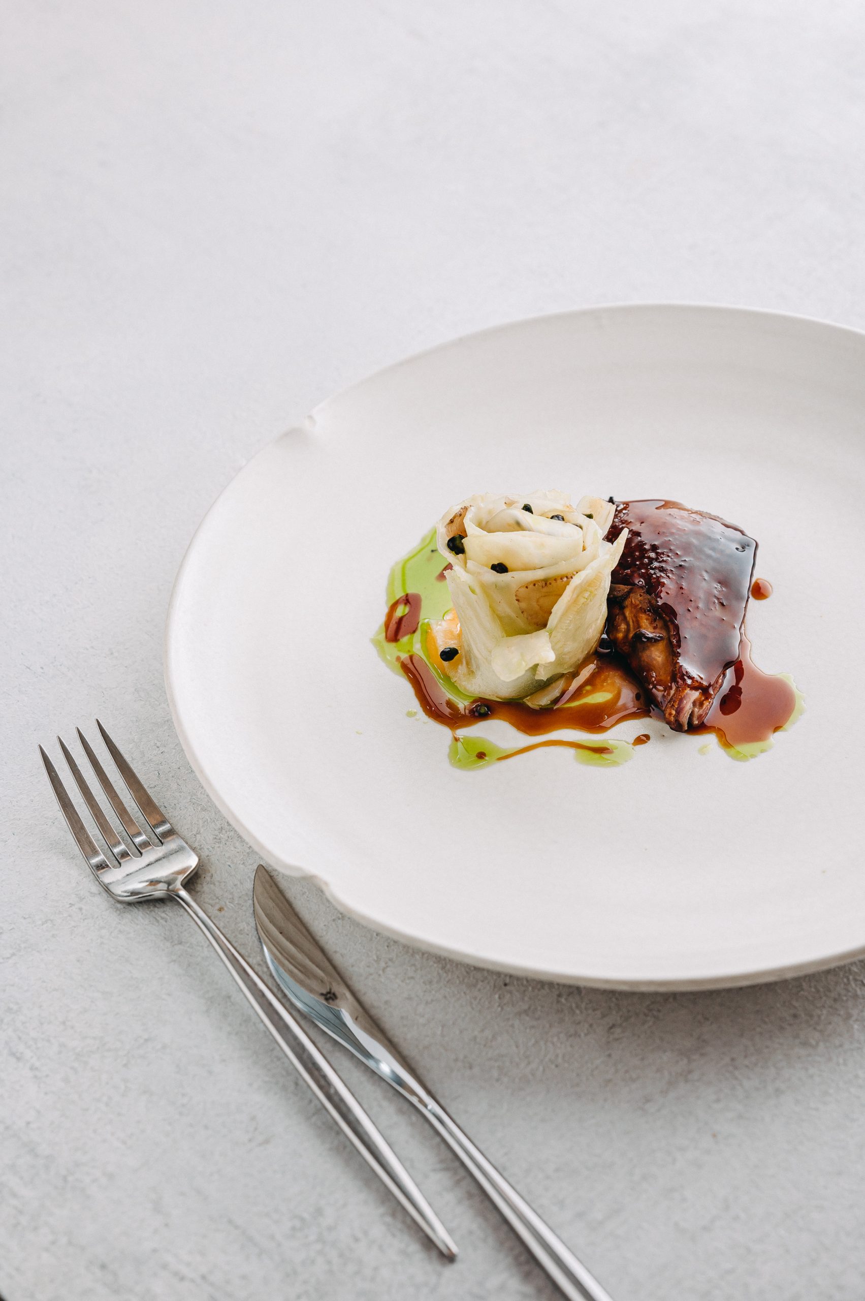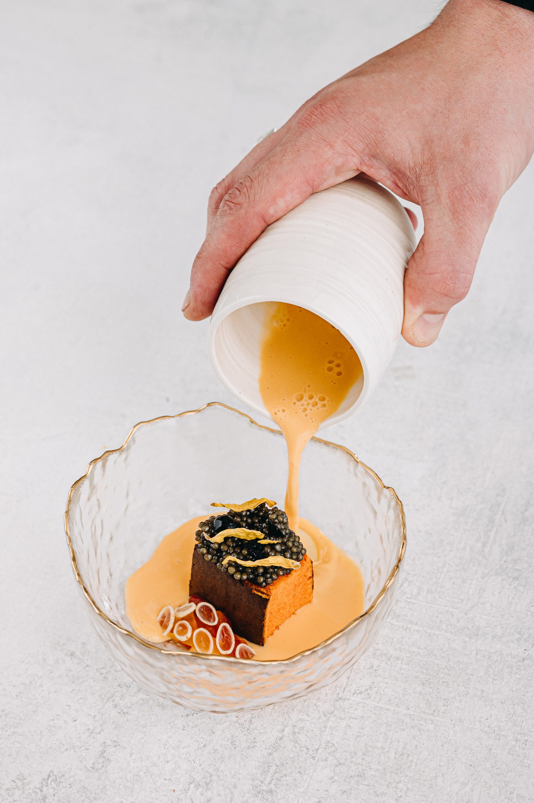 A látogatás után el szoktam hozni egy-egy alapanyagot. A kreatív folyamat ott kezdődik, amikor kitaláljuk, hogyan lehet ezeket feldolgozni, mivel lehet összepárosítani. Itt a fenntarthatóság is képbe kerül. Ha mondjuk hozunk egy kecsegét, végiggondoljuk, hogy melyik részéből mit tudunk készíteni. Meg tud-e jelenni különböző formákban különböző ételekben? Például úgy, hogy az egyikben nem a kecsege a fő téma, viszont felhasználjuk a halkollagént, főzünk belőle egy olyan vizet, ami kocsonyásítja a zöldség alaplevünket. Ez egy nagyon jó játék.