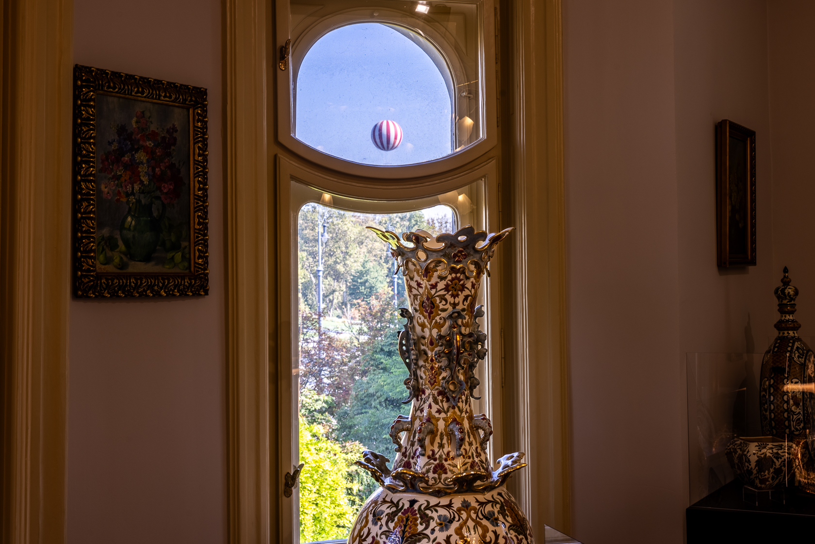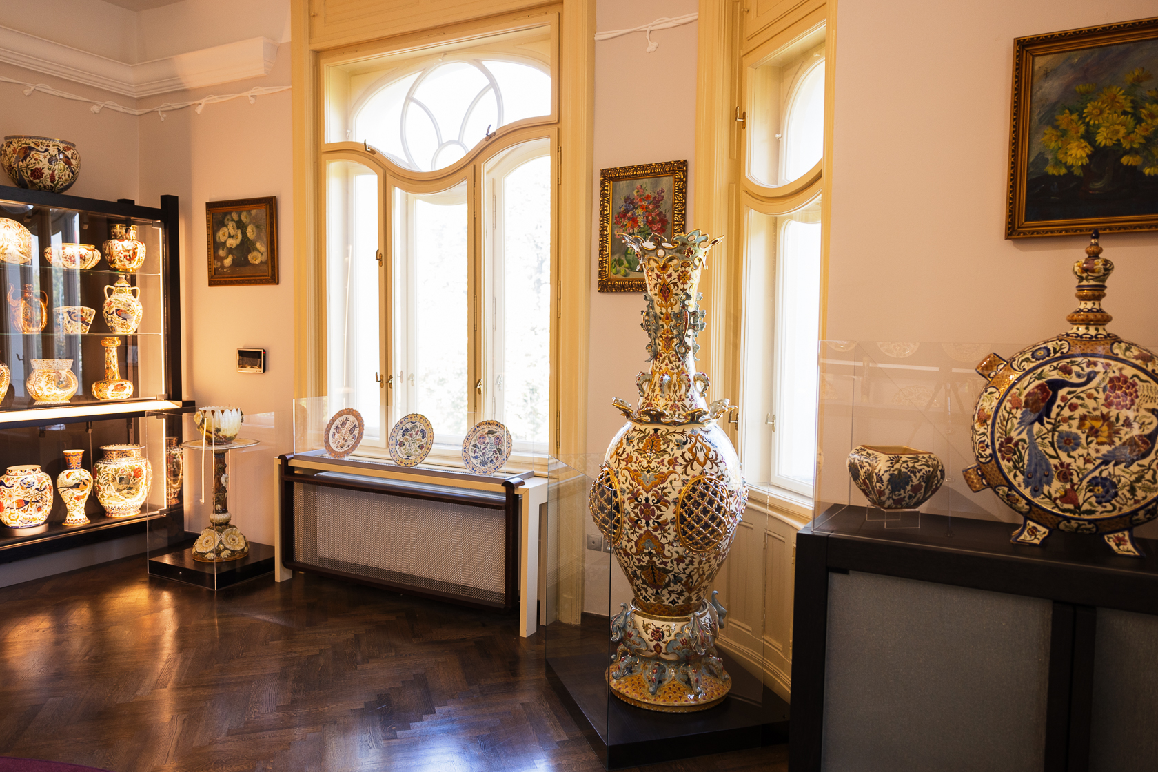 Ahogy körbenézünk itt a villában, nemcsak Zsolnay-műtárgyakat láthatunk, de illusztris magyar festők képeit is. Most éppen Rippl Rónai, Egry József, Perlrott Csaba Vilmos, ef. Zámbó István, Náray Tamás festményei lógnak a falakon.