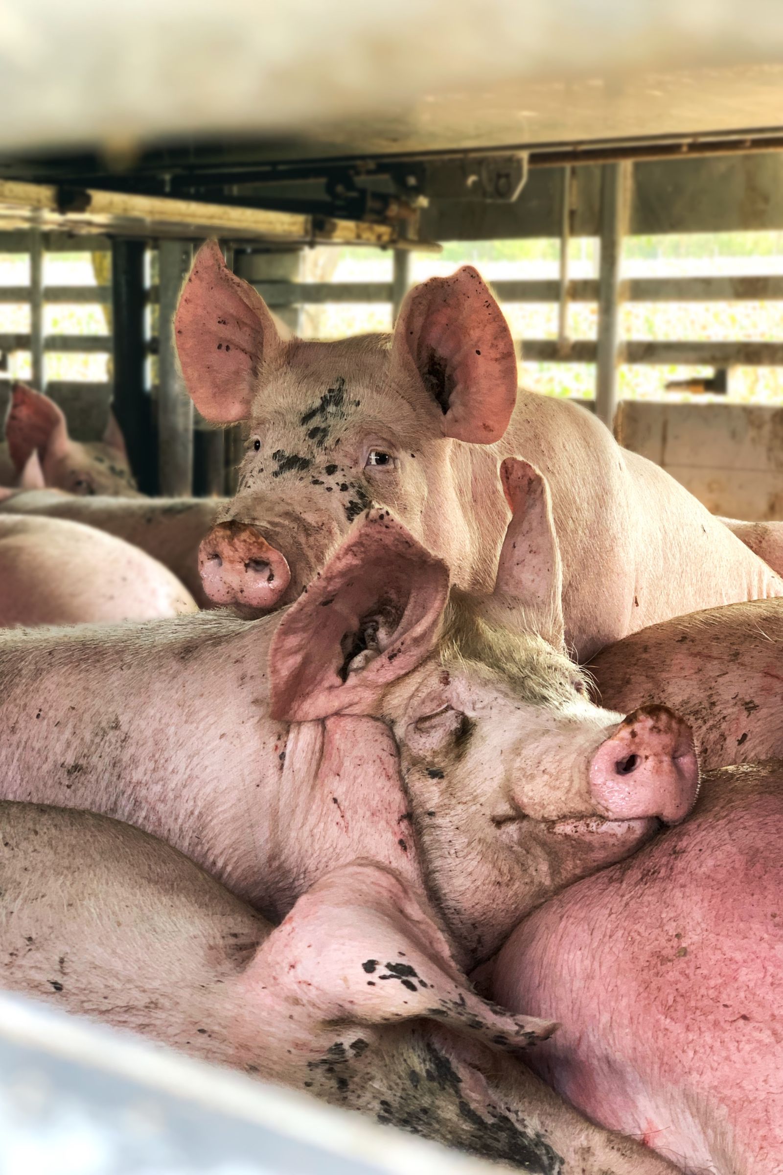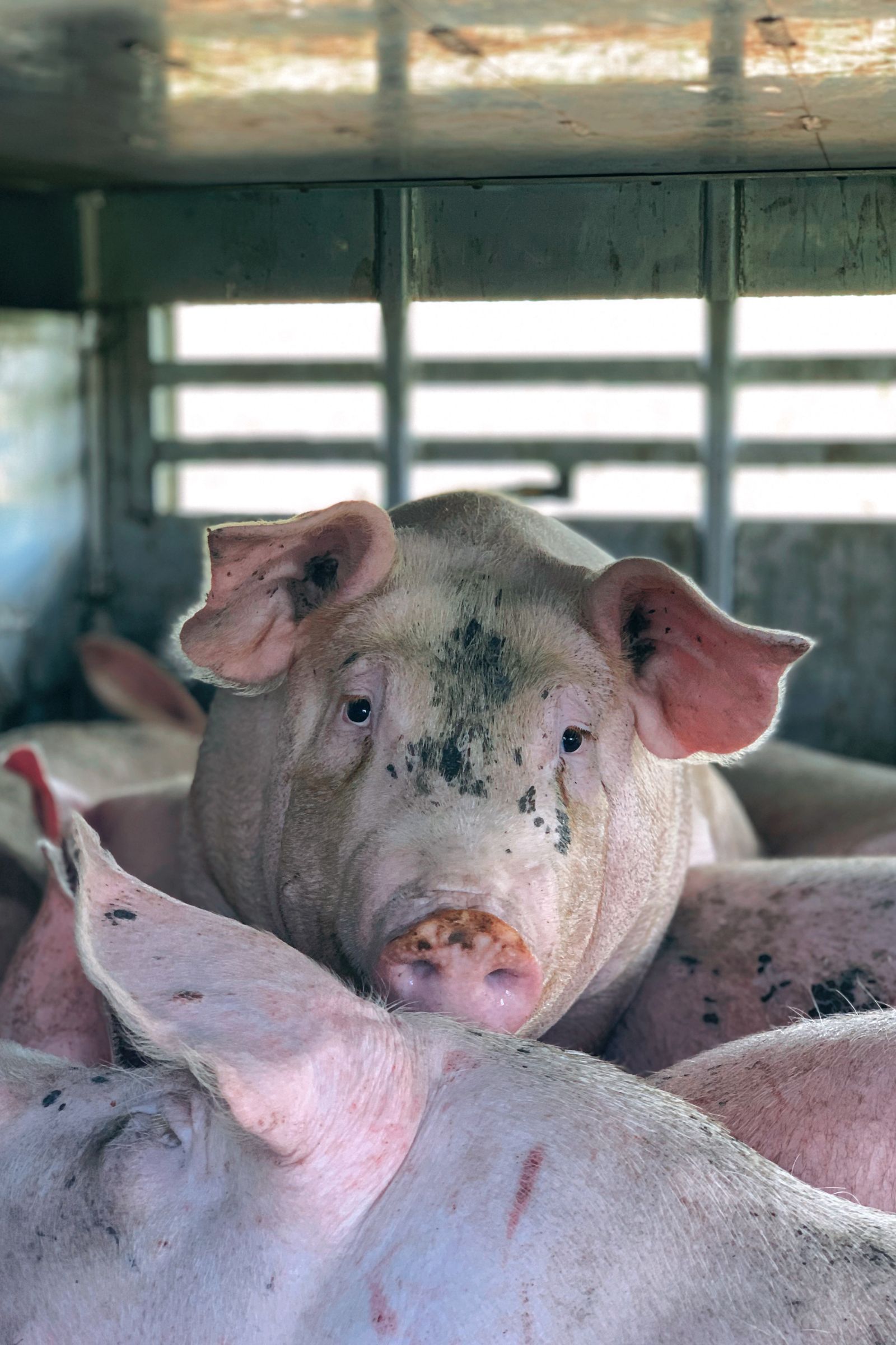 2019 körül indult egy külföldi kezdeményezés, az Animal Save Movement. Aktivisták látogattak vágóhidakhoz, vizet adtak a várakozó állatoknak, megsimogatták őket, próbáltálták őket megnyugtatni, és képeket, videókat készítettek róluk. Amikor megláttam ezeket, arra gondoltam, hogy szeretném én is ezt csinálni, megmutatni, hogy Magyarországon is így történnek a dolgok, nemcsak Amerikában, a világ másik felén. Kiskunfélegyházán lakom, az itteni vágóhídhoz szoktam elmenni, de jártam már Cegléden, és volt már ilyen esemény Mohácson is. A vágóhídon belülre nyilván nem engednek be, ott még brutálisabb dolgokat lehetne látni. Én a parkoló kamionokat és a rajtuk akár többszáz összezsúfolt állatot fotózom le. Ezek általában sertések, nem ritkán daganatokat, nyílt sebeket látni rajtuk, véresen érkeznek, nyáron melegük van, szomjasak.