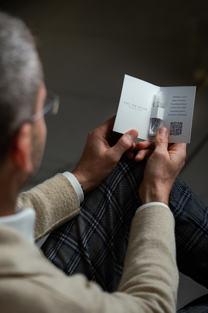 A kampány keretében belül az online rendelések mellé illatmintát kaphattak a vásárlók az Eau de Parfum 2050-ből. Arról, hogy mit is tartalmaz ez a kis fiola, Zólyomi Zsoltot kérdeztük. „Az Eau de Parfum 2050 tulajdonképpen egy elképzelt, hipotetikus jövő illatát szimbolizálja” – magyarázza a szakember. „Az illatminta arra hívja fel a figyelmet, hogy az illatok legjelentősebb összetevői hamarosan eltűnhetnek, ugyanis a szívjegyek, a fejjegyek és az alapjegyek is hiányoznak belőle – aki kipróbálja, a saját bőrén érzékelheti a környezetváltozás hatásait. Vagyis a mintában konkrétan víz van, ez rá is van írva hátuljára, ezért nincs illata sem.